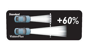 Żarówki samochodowe Philips VisionPlus emitują o 60% więcej światła, dzięki czemu kierowca widzi dalej, co pozwala zwiększyć bezpieczeństwo i komfort prowadzenia. Żarówki VisionPlus to wysoka wydajność i doskonała wartość — to właśnie tego szukają wymagający kierowcy.