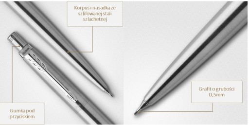 Parker Jotter Stalowy to jedyna seria Parker zawierająca ołówek automatyczny. Pod przyciskiem znajduje się gumka - gdy się wytrze może przełożyć ją na drugą stronę, zaś pod gumką znajduje się zapas grafitów. Ołówek wyposażony on został w przyciskowy mechanizm wysuwania polimerowego grafitu 0,5mm HB.