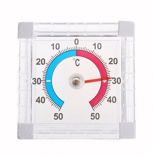 Termometr bimetaliczny w kształcie kwadratu wykonany z przezroczystego tworzywa. Skala nadrukowana jest bezpośrednio na plastiku. Na brzegach termometru znajdują się kawałki taśmy samoprzylepnej, co sprawia, że termometr po przymocowaniu jest bardzo stabilny.