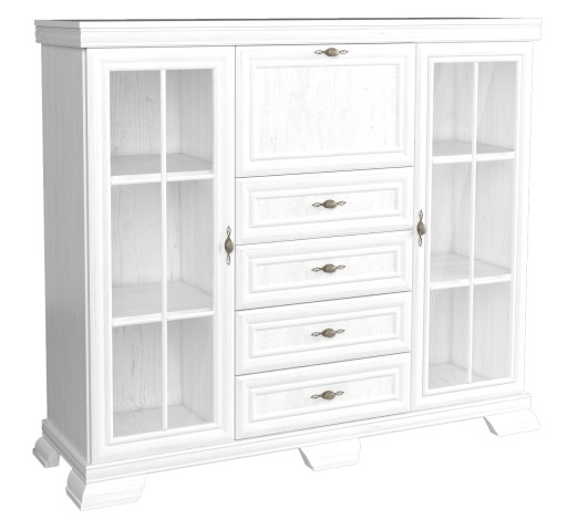Wysoka komoda ze szkłem KK7 KORA posiada barek, cztery szuflady oraz dwie szafki z przeszklonymi frontami.