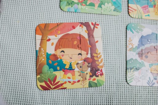 Puzzle liczą sobie kolejno coraz więcej elementów (6, 9, 12 i 16), dzięki czemu dzieci stopniowo uczą się radzić sobie z trudniejszymi układankami.