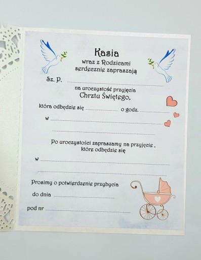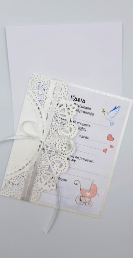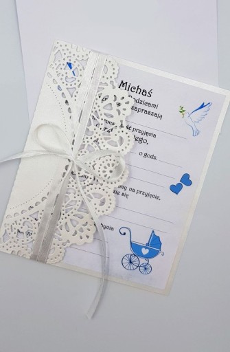 PRZEDMIOTEM SPRZEDAŻY SĄ PIĘKNE AŻUROWE ZAPROSZENIA NA CHRZEST ŚWIĘTY. JEDYNE W SWOIM RODZAJU. WYKONANE Z NAJWYŻSZEJ JAKOŚCI PAPIERU. KOLOR PERŁOWEJ BIELI W WERSJI DLA CHŁOPCA LUB DZIEWCZYNKI. PO ZAKUPIE PROSZĘ O PODANIE IMIENIA DZIECKA. INNE KOLORY NA POZOSTAŁYCH AUKCJACH.