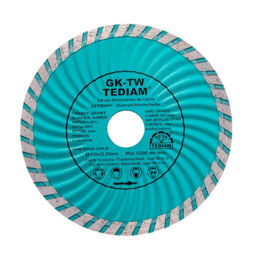 Tarcza diamentowa z wieńcem segmentowym renomowanej marki TEDIAM model GK-TW to produkt wykonany w nowej technologii produkcji, przeznaczony do wysokiej jakości cięcia twardych materiałów takich jak: granit, klinkier, kamień naturalny i sztuczny, betonu oraz innych materiałów budowlanych.