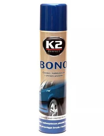 K2 BONO to wysoce skuteczny produkt do odnawiania i zabezpieczania wszelkich powierzchni plastikowych, winylowych, elementów gumowych. Przywraca oryginalny kolor. Pozostawia głęboki połysk. Idealnie nadaje się do zderzaków, listew bocznych, spojlerów i innych plastikowych elementów samochodowych. Długotrwale zabezpiecza przed wyblaknięciem, spękaniem i działaniem promieni UV.