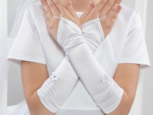 Rękawiczki będąc ważnym elementem garderoby każdej elegantki zdecydowanie dodają szyku dziewczynkom w dniu ich Pierwszej Komunii. Na każdej dłoni wyglądają pięknie. Uszyte są z elastycznej tkaniny dzięki czemu ładnie dostosują się do kształtu ręki dziecka. Krótsze lub długie rękawiczki komunijne dla dziewczynek na palec ładnie prezentują się w zestawie z wianuszkiem i torebką pierwszokomunijną. Oczko, dzięki któremu zakłada się je na palcu wykonane jest w całości z perełek.