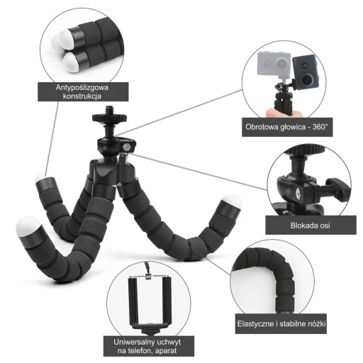 Dzięki stabilnym, elastycznym nóżkom, uchwyt może posłużyć jako statyw.