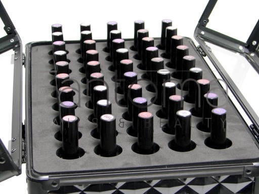 W górnej części, we wnętrzu kuferka, umieszczona jest specjalna wkładka na 45 lakierów, która zapobiega przemieszczaniu oraz zabezpiecza lakiery podczas podróżowania! Wkładkę można wyjmować, spód kuferka wyściełany welurem.