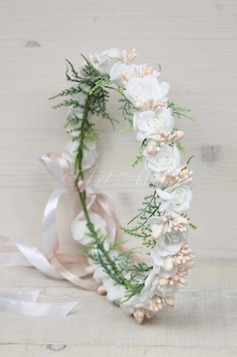 Subtelny i uroczy wianek komunijny, pełen białych kwiatów róży, zdobiony pęczkami perełek w kolorze pudrowego różu, gałązkami paproci oraz wstążkami dopasowanym kolorystycznie do wianka.