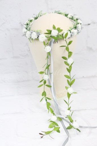 Dodatkowo jest możliwość do wianuszka dokupić szyfonową kokardkę z różą na grzebyku lub girlandę z kwiatami również na grzebyku, można je wpiąć ją w tył wianuszka by był bardziej okazały.