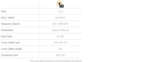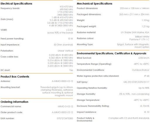 Wysokowydajna wieloczęstotliwościowa antena MIMO-3-12 2 w 1 w jednej obudowie. Dwukomórkowe anteny MIMO (dla 2G / 3G / 4G) obejmują współczesne pasma od 690 MHz do 2700 MHz, a także nowe pojawiające się widmo LTE i 5G dla pasm CBRS 450 MHz i 3,5 GHz, które staje się popularne wśród różnych międzynarodowych operatorów sieci komórkowych dla LTE. Ultraszerokopasmowa wydajność anteny pozwala na użycie jej przez różnych operatorów i różne technologie i jest gotowa na przyszłe technologie komórkowe do 3,8 GHz dla aplikacji 5G. Antena przewyższa wydajność większości konkurentów dzięki dbałości o projekt tej wysokowydajnej anteny. Wzorce promieniowania wszystkich elementów promieniujących zapewniają doskonałą równowagę między wielokierunkowością, różnorodnością wzorców i dobrymi zdolnościami promieniowania na żądanej wysokości. Jest to ważne kryterium dla rynku transportowego i morskiego. dla którego antena została specjalnie zaprojektowana. Główne zastosowania to pojazdy komercyjne / przemysłowe, morskie, M2M i inne systemy IoT wykorzystujące szeroką gamę technologii radiowych, zachowując przy tym przyszłość w szerokim paśmie częstotliwości.