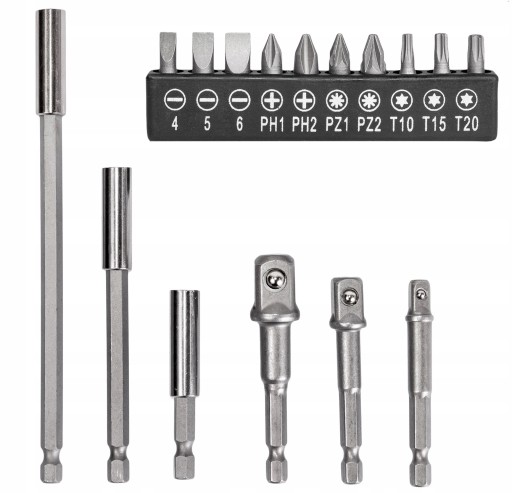 Zestaw jest kompatybilny z większością dostępnych na rynku wkrętarek i wiertarek. Wykonany ze stali CR-V , gwarantuje trwałość i niezawodność w każdych warunkach pracy.