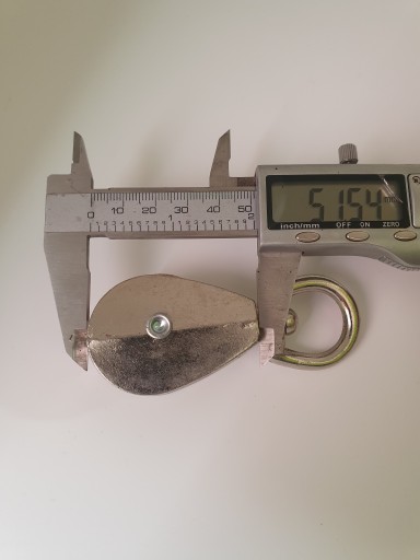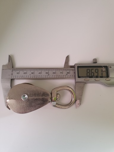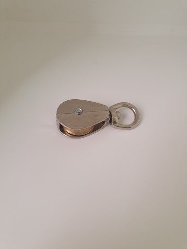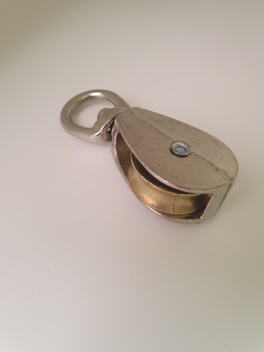 Bloczek obrotowy linowy niklowany z pojedynczym kółkiem oraz krętlikiem, przeznaczony do ręcznego podnoszenia oraz podwieszania ciężarów z użyciem lin.