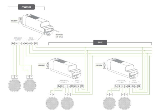 Jednostka centralna urządzenia tzw. Master wyposażony jest również w wyjście liniowe tzw. Slave(66, 65, 4, 62). Wyjście to umożliwia podłączenie dodatkowego wzmacniacza. Dzięki takiemu rozwiązaniu system ten umożliwia montaż dodatkowej ilości głośników w dwóch lub większej ilości pomieszczeń(np. łazienka, toaleta kuchnia, salon, sypialnia) i odtwarzać dźwięk w tym pomieszczeniu, w którym w danym momencie Nam odpowiada. Nie ma możliwości odtwarzania różnej muzyki/stacji radiowych w każdym z pomieszczeń z osobna. Mamy jednak możliwość zaprogramowania osobnych ustawień TURN-ON(automatyczne włączania wraz z oświetleniem) oraz IDEAL(ustawienia preferowane: głośność, balans, tony niskie i wysokie) dla wzmacniaczy MASTER oraz SLAVE.