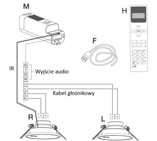 Wystarczy wywiercić w suficie dwa otwory o średnicy 150 mm dla głośników(L i R). Zamontuj jednostkę sterującą M przez otwór głośnika R. Staraj się, aby kabel antenowy został umieszczony z dala od potencjalnych źródeł zakłóceń, takich jak świetlówki, zasilacze, lampy halogenowe, wentylatory, silniki itp., które mogłyby utrudnić odbiór stacji radiowych i wpływać na jakość dźwięku. Po umiejscowieniu jednostki centralnej pozostaje podłączenie przewodów głośnika oraz zasilania. Ostatnim etapem jest umieszczenie głośników w wcześniej wywierconych otworach, Odległość pomiędzy modułem zasilającym M a urządzeniem zewnętrznym wyposażonym w bluetooth nie powinna przekraczać 10m. Zaleca się również, aby głębokość niezbędna do zabudowy modułu FM M wynosiła ok. 95mm.