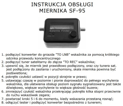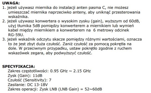 1. jeżeli używasz miernika do instalacji anten pasma C, nie możesz umieszczać miernika naprzeciwko anteny, aby uniknąć przesterowania wskaźnika.