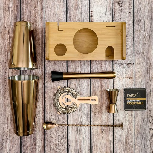 FABV Cocktail Making Set - Gift Ready Cocktail Making Set with Recipe Book - Luxury Rose Copper Cocktail Set with Stand and Boston Cocktail Shaker - Full Bartender Kit for Home & Bar