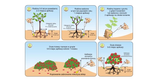 Szczepionkę mikoryzową podajemy do szczelin w podłożu w miejscu gdzie występują najcieńsze korzenie rośliny. Dla młodych roślin jest o to około odległość 10 x średnicy pnia. Dla starszych roślin szczepienie wykonuje się na końcu promienia korony.