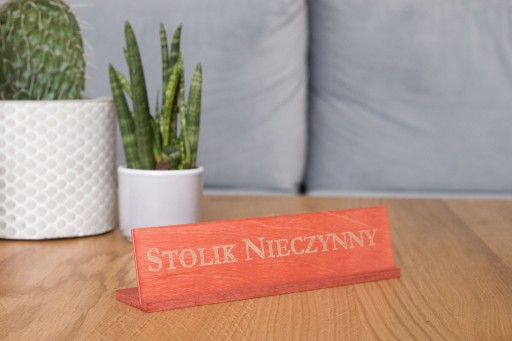 Drewniana tabliczka przymocowana do solidnej podstawki z wyraźnym grawerowanym napisem Stolik Nieczynny.