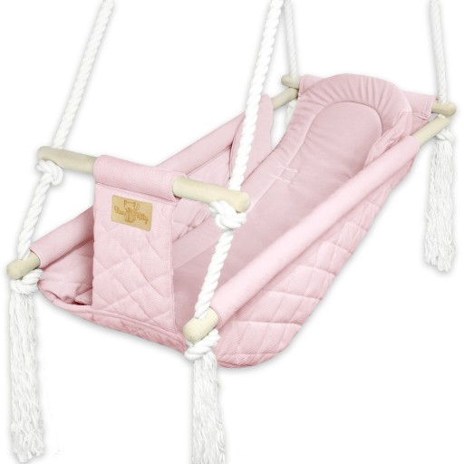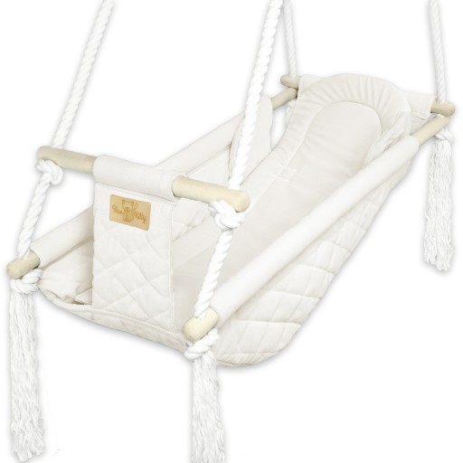 Kołyska wykonana jest z mocnych, oszlifowanych drążków oraz wytrzymałych linek bawełnianych. Siedzisko i usztywniona wkładka uszyte są najwyższej jakości tkaniny Velvet.