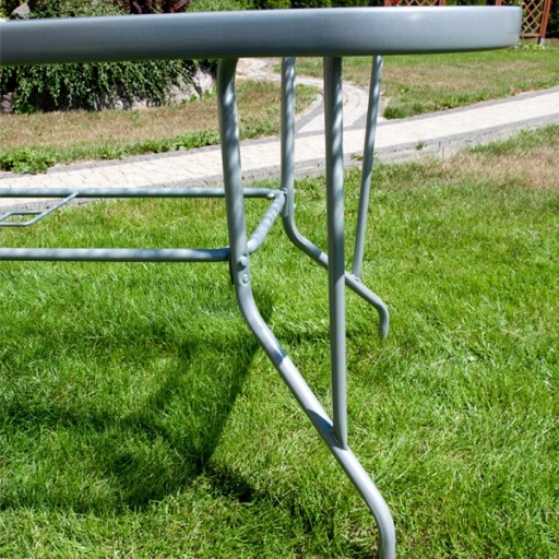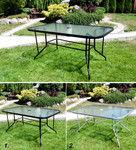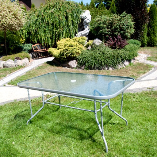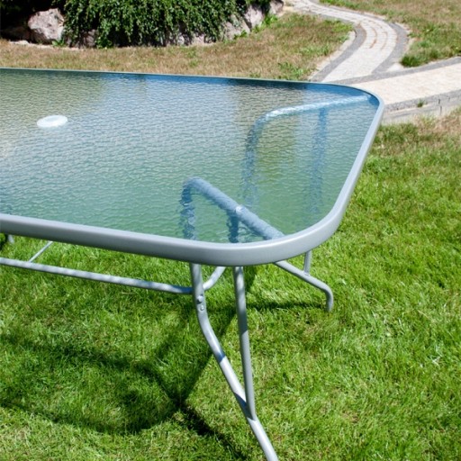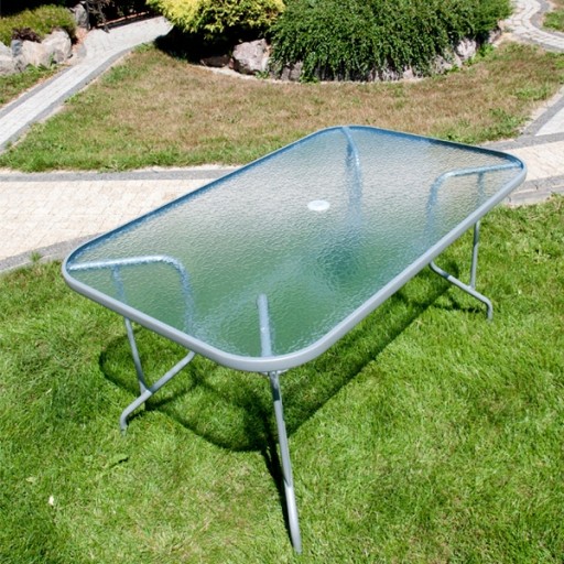 Blat stołu wykonany jest z hartowanego szkła. Posiada otwór z zaślepką do umieszczenia parasola