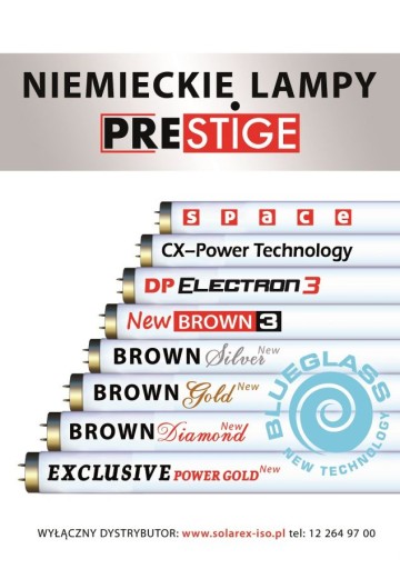 Lampy marki Prestige- dzięki zastosowaniu nowoczesnej technologii oraz wysokiej klasy komponentów zapewniają trwałą i efektywną opaleniznę – tak bardzo oczekiwaną i poszukiwaną przez klientów studiów solaryjnych.