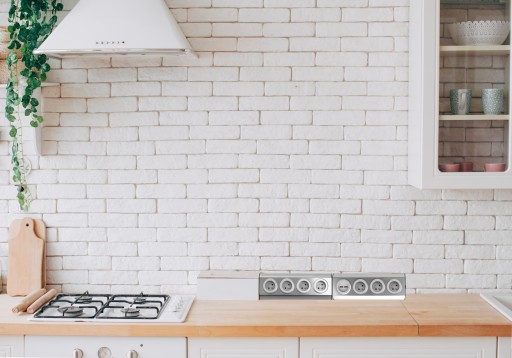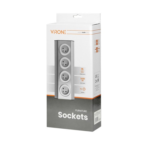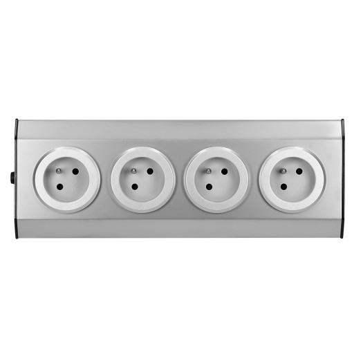 Nowoczesny zestaw czterech gniazd sieciowych z uziemieniem, który idealnie nadaje się do montażu w kuchni i biurze, na powierzchniach płaskich i w narożnikach.