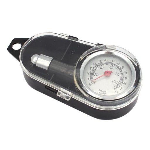 Ciśnieniomierz 0.5- 7.5 atmosfery, metalowy manometr w plastikowym pudełku.