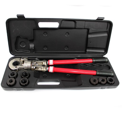 Profesjonalna ręczna praska hydrauliczna do zaciskania złączek na rurach PEX-AL-PEX, PERT-AL-PERT. W zestawie znajduje się 8 matryc U i TH o różnej średnicy. Wyposażona w siłownik hydrauliczny umożliwiający mocne, precyzyjne i szczelne zaciśnięcie złączki z siłą 60kN. Obrotowa głowica 360° ułatwiająca pracę w trudno dostępnych miejscach. Bardzo łatwy sposób wymiany matryc. Wygodne, teleskopowe rękojeści wydłużane z 57cm do 80 cm, pozwalają osiągnąć dużą siłę ścisku, bez używania wielkiej siły rąk do zaciśnięcia złączki.