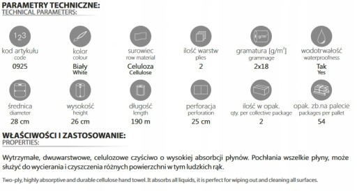 Długość rolki: 190 m średnica (cm): 28 Wysokość (cm) 26 perforacja 25 (cm)