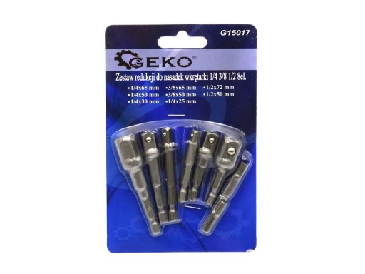 Zestaw specjalistycznych redukcji, adapterów do wkrętarki. Redukcje pozwalają na pracę wkrętarką z nasadkami. Elementy zestawu wykonane są ze stali narzędziowej, która gwarantuje ich wytrzymałość i długą żywotność.