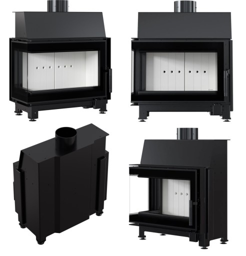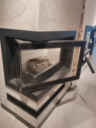 Wkład kominkowy z dwoma szybami zestawionymi ze sobą pod kątem prostym.
