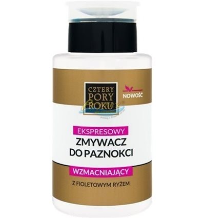 Ekspresowy zmywacz do paznokci Cztery Pory Roku w pompce szybko i skutecznie usuwa lakier. Innowacyjny dozownik pozwala w łatwy i wygodny sposób korzystać z produktu zabezpieczając przed rozlewaniem i rozpryskami. Wyjątkowa formuła wzbogacona o ekstrakt z fioletowego ryżu wzmacnia paznokcie i odpowiednio pielęgnuje skórki. Przeznaczony również do paznokci sztucznych.