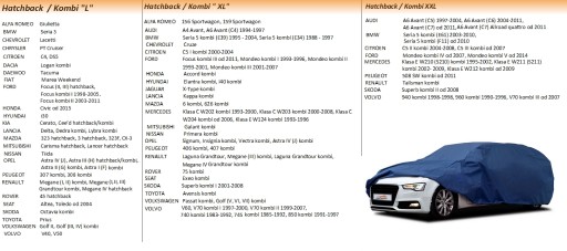 PONIŻEJ TABELA Z ROZMIARAMI - JEŻELI MACIE PAŃSTWO PROBLEM Z DOBRANIEM ODPOWIEDNIEGO ROZMIARU LUB JEŻELI W SPISIE NIE MA PAŃSTWA AUTA, TO PO ZAKUPIE PROSZĘ O WIADOMOŚĆ Z MODELEM, ROCZNIKIEM I RODZAJEM NADWOZIA, A MY DOBIERZEMY ODPOWIEDNI ROZMIAR