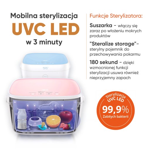 Wielofunkcyjny pojemnik do sterylizacji zasilany technologią UVC LED z opatentowanym „złotym chipem”. Jedno kliknięcie wystarczy, aby osiągnąć 99.9% wskaźnika dezynfekcji w ciągu zaledwie 59 sekund. Idealne, aby dbać o Twoje sprzęty codziennego użytku!. Urządzenie posiada kilka unikalnych funkcji. Suszarkę która włączy się w momencie włożenia mokrych produktów. Posiada dodatkowo funkcję „steralize storage” pozwalającą aby jednym kliknięciem całe urządzenie stało się sterylnym pojemnikiem. Wyświetla się wtedy funkcja która informuje że w pojemniku jest sterylne środowisko. Dzięki tej opcji można np.: przechowywać pokarm w pojemniku dzięki czemu jest on świeży przez wiele dni. 180 sekund to kolejna funkcja wzmocnionej sterylizacji. Funkcja wykorzystuje wszystkie 40 lamp UVC. Sterylizacja UVC zabija ponad 99,9% wszystkich bakterii dzięki czemu usuwa dodatkowo nieprzyjemny zapach.