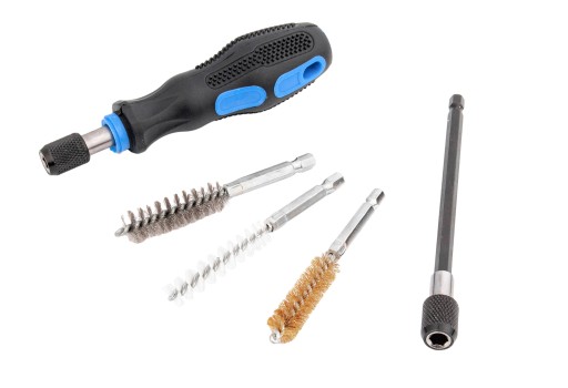 W zestawie rękojeść z uchwytem do szybkiego mocowania szczotek oraz przedłużka, szczotek można używać ręcznie lub zamontować do wiertarki.