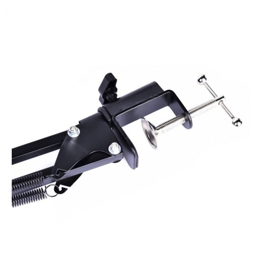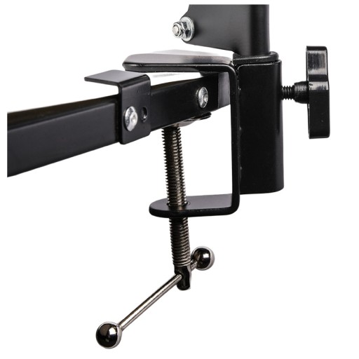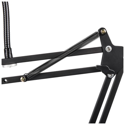 - Wysięgnikowe ramię mikrofonowe mocowane do blatu składa się z dwóch sekcji i posiada szeroki zakres regulacji
