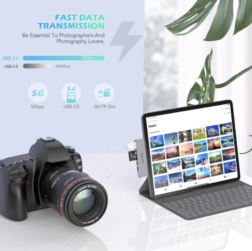 - ▶ 【Bardziej wygodne porty rozszerzeń ong Oprócz gniazda słuchawkowego 3,5 mm możesz słuchać muzyki przez słuchawki lub głośnik. Gniazda kart SD / TF i port USB 3.0 umożliwiają przesyłanie danych z prędkością do 5 Gb / s. Port USB 3.0 obsługuje połączenie z pendrive'em w celu odczytania zdjęć (proszę uaktualnić do iOS 13), mysz, klawiaturę i inne urządzenia USB.