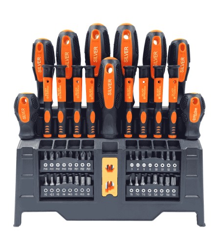 Zestaw 50 sztuk wkrętaków: płaskich, krzyżowych i precyzyjnych; bitów wraz z przedłużką na stojaku + magnetyzer / demagnetyzer