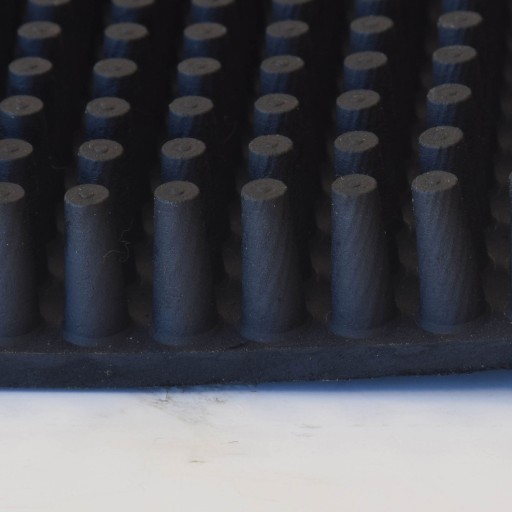 • Grube krawędzie dookoła maty – wyższe o 0,635cm niż wypustki, pozwalają na użycie ciekłego środka do dezynfekcji. Do maty można wlać 4 litry środka dezynfekującego. (Wskazówka: używaj czwartorzędowych soli amonowych, jodyny, chloru lub innego środka, ale zawsze należy sprawdzić stężenie tych roztworów. Większość środków do dezynfekcji jest silnie skoncentrowanych i należy je przed użyciem rozcieńczyć).