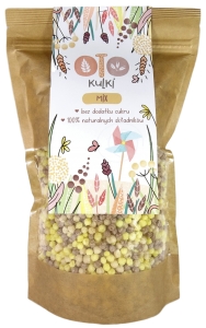 Kulki MIX — Oto mieszanka z bogatą osobowością! Pełna kolorów, a jednak naturalna i bez dodatku cukru. Jeżeli komuś tego mało wystarczy łyżka Owoców z Tęczowego Ogrodu i śniadanie jest jeszcze barwniejsze i zdrowsze. Chrupiące i drobne kuleczki są świetną alternatywą dla popularnych wśród dzieci przesłodzonych kuleczek.