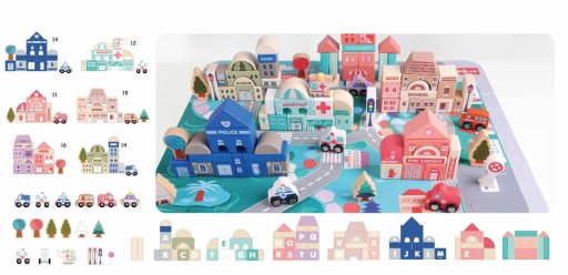 WSPANIAŁY ZESTAW KOLOROWYCH EDUKACYJNYCH DREWNIANYCH KLOCKÓW - MIASTO 115 ELEMENTÓW