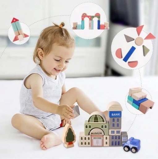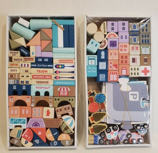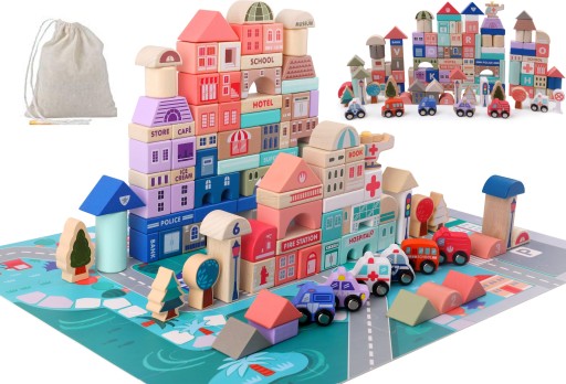 WSPANIAŁY ZESTAW KOLOROWYCH EDUKACYJNYCH DREWNIANYCH KLOCKÓW - MIASTO 115 ELEMENTÓW