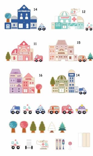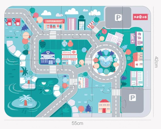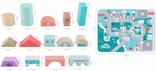 Dodatkowym bardzo dużym atutem jest to, że do klocków jest dołożona podkładka - puzzle ze schematem małego miasteczka, wymiary podkładki 42X55cm.