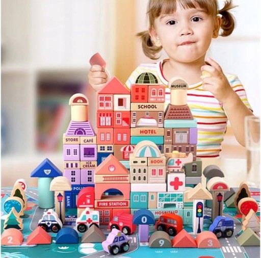 Z klocków można zbudować wspaniałe miasto, z licznymi budynkami, można ustawić pojazdy, drzewa znaki.