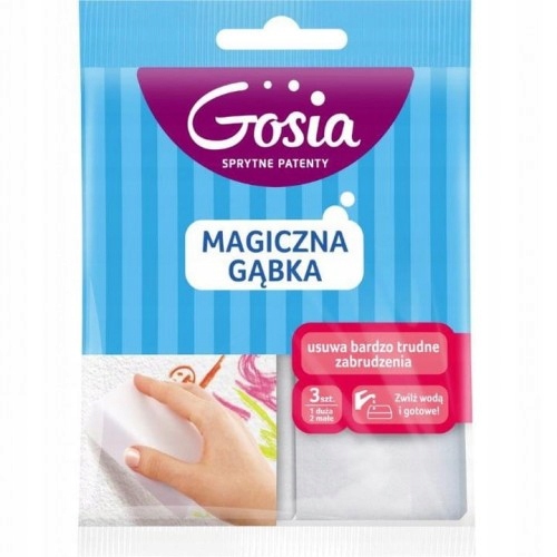 Magiczna Gąbka Gosia 3 szt. usuwa bardzo trudne zabrudzenia bez konieczności użycia detergentów w zestawie trzy sztuki Innowacyjne rozwiązanie Magiczna gąbka Gosia przeznaczona jest do usuwania najtrudniejszych zanieczyszczeń. Jest dziecinnie łatwa w użyciu i nie wymaga użycia detergentów, przed użyciem wystarczy ją zmoczyć w wodzie. Produkt jest innowacyjnym rozwiązaniem, dzięki specjalnej strukturze, podczas sprzątania, zużywa się jak gumka do ścierania. Upora się z najtrudniejszymi zabrudzeniami Magiczna gąbka Gosia poradzi sobie z tak trudnymi zabrudzeniami jak ślady kredek i pisaków czy plamy na wszelkiego rodzaju powierzchniach, a nawet rysy na butach.