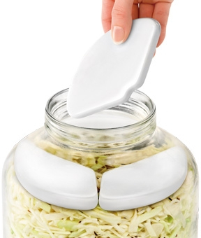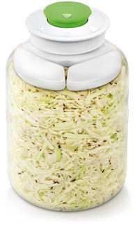 Szczelne wieczko z zaworem reguluje ciśnienie powstające podczas kiszenia i nie wpuszcza powietrza do wnętrza słoika
