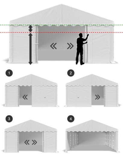 Umieszczone po obu stronach namiotu wejścia wyposażone są w mocne zamki. Pozwoliło to na podzielenia bramy na dwa niezależne skrzydła. Ten prosty system otwierania i zamykania zapewnia komfort codziennego użytkowania.