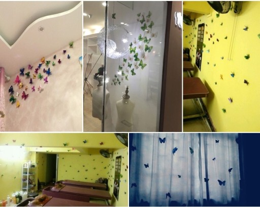 Przykładowe aranżacje z wykorzystaniem motyli dekoracyjnych w różnych kolorach: