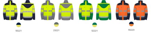 Dwukolorowa kurtka odblaskowa 2w1 (kurtka + bezrękawnik). Odblaskowe pasy na korpusie i rękawach. Kaptur ze ściągaczem. Kieszeń na piersi zapinana na zamek błyskawiczny. Dwie kieszenie z przodu. Ściągacz na dole. Regulowane mankiety ze ściągaczem, zapinane na rzep. Zamek błyskawiczny pod plisą zapinaną na rzep. Wewnętrzna kieszeń na piersi. Odpinane rękawy.