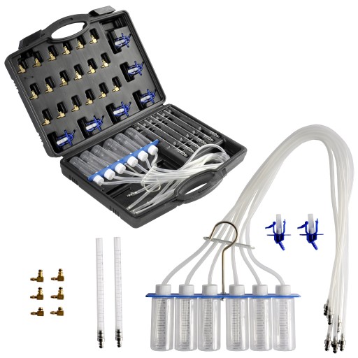 Przyrząd służy do szybkiego i efektywnego pomiaru objętości paliwa na przelewie każdego wtryskiwacza. Umożliwia jednoczesny pomiar na 6 wtryskiwaczach. Zestaw zawiera 24 szt. adapterów do zastosowania w systemach: BOSCH, SIEMENS, DENSO oraz DELPHI.